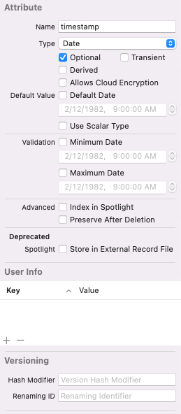 This isn’t the model though, at least as far as Core Data is concerned. These subclasses are handy, but we have some work to do. First, here’s the Event entity and its timestamp attribute: