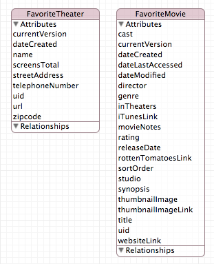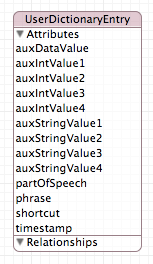 Neither of them turns out to be very interesting. Trailers has two entities and the spelling dictionary just one. Neither has any relationships. But this lack of interesting detail is, really, the interesting part. In the only two examples I’ve been able to find of Apple using iCloud with Core Data, the data models are almost trivial. Less complex, in fact, than you’d expect in a decent introduction to using Core Data.